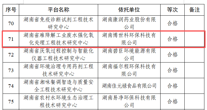 近日,湖南省科学技术厅发布省级工程技术研究中心验收评估结果,以湖南博世科为依托单位的“湖南省难降解工业废水强化氧化处理工程技术研究中心”顺利通过验收。