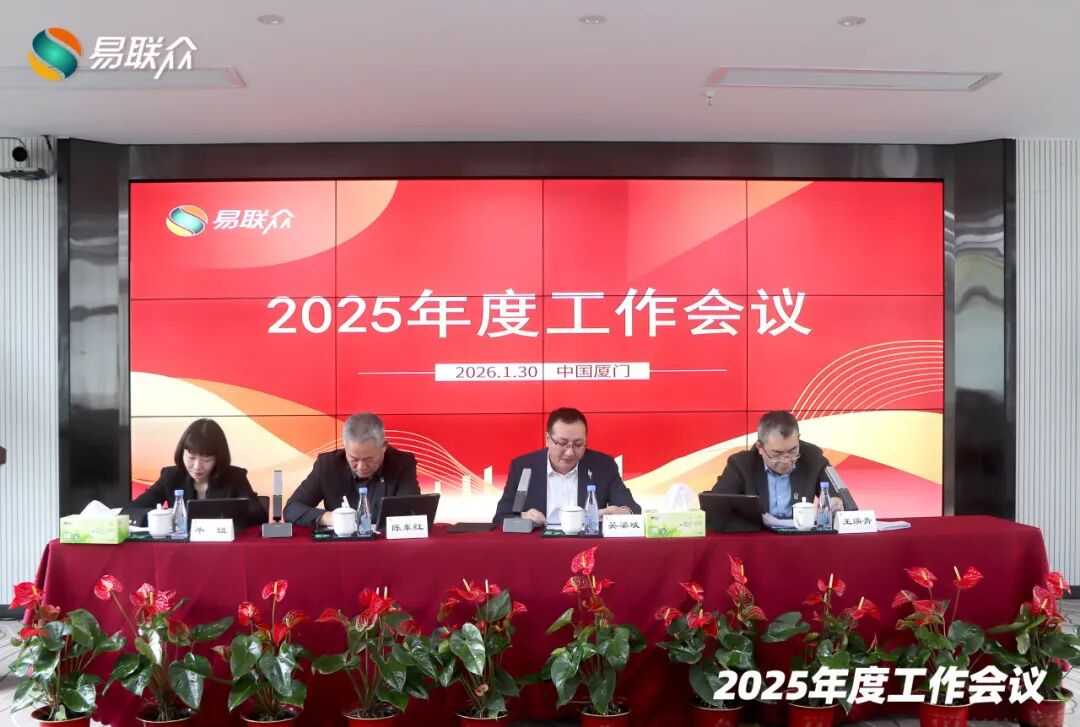 1月30日,易联众2025年度工作会议在厦门总部隆重召开。会议全面复盘2025年经营管理成效,系统谋划并部署2026年重点发展任务,凝聚发展共识,明确前进方向。本次会议采用“线上+线下”联动模式,易联众集团董事长兼总裁吴梁斌等集团领导、各子公司经营管理团队及集团各部门负责人等100余人参会,会议由集团副董事长兼副总裁王焕青主持。