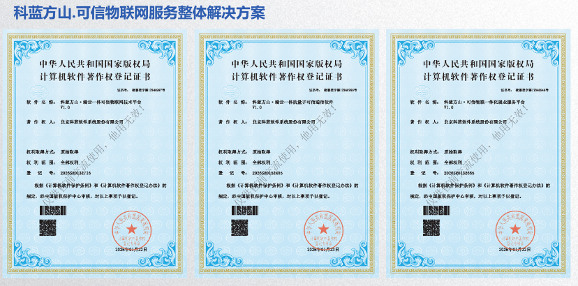 科蓝软件“方山”系列全栈全国产信创可信物联网产品体系,通过“支撑平台-可信通信-场景落地”的完整产品矩阵,实现对关基行业可信物联网全链条的覆盖。三款核心产品均完成产品定型、通过软件著作权认证,实现“发布即交付”,快速响应金融、交通、政务等关基行业领域的数字化转型需求,提供安全可控、自主高效的一体化解决方案。