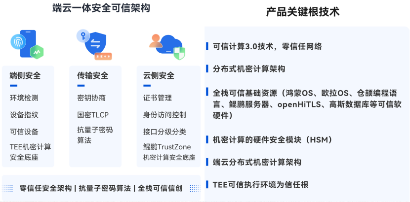 高性价比平滑部署:在满足金融级高安全要求的同时,依托端云TEE构建可信环境,运用国密与抗量子算法,通过软硬协同的技术支持硬件级安全和软件功能无损升级,适配不同环境实现双TEE/单TEE可信交付,无需改变现有架构即可平滑升级,提供全链路SDK软件组件显著降低企业改造成本。