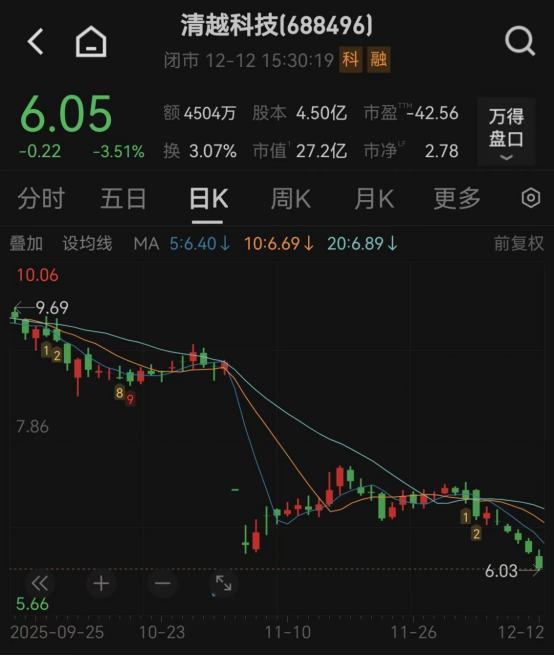 12月12日,清越科技股价收于6.05元/股,为上市以来新低,公司最新市值约27亿元。