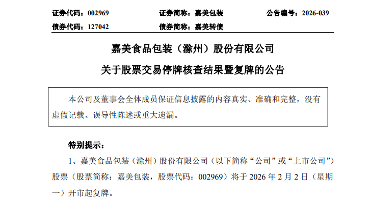 嘉美包装(002969)2月1日公告,此前公司就股票交易波动情况进行停牌核查,鉴于相关核查工作已完成,经公司向深交所申请,公司股票将于2026年2月2日开市起复牌。