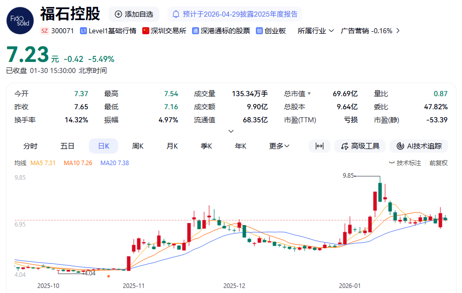 福石控股最新股价报7.23元/股,总市值接近70亿元。