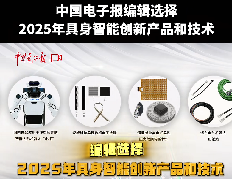 2026年1月30日,由中华人民共和国工业和信息化部主管的中国电子报,综合考察技术、市场、创新性等多维度指标,发布2025具身智能创新产品和技术,汉威科技集团柔性传感电子皮肤成为十大入选产品和技术之一。