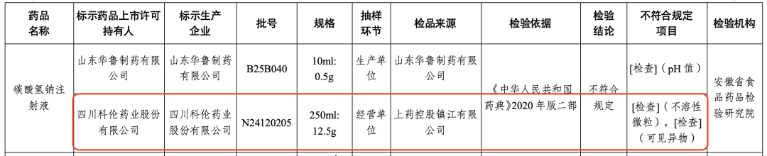 根据通告内容,经安徽省食品药品检验研究院检验,标示为山东华鲁制药有限公司、四川科伦药业股份有限公司生产的2批次碳酸氢钠注射液不符合规定,不符合规定项目涉及pH值、不溶性微粒、可见异物。