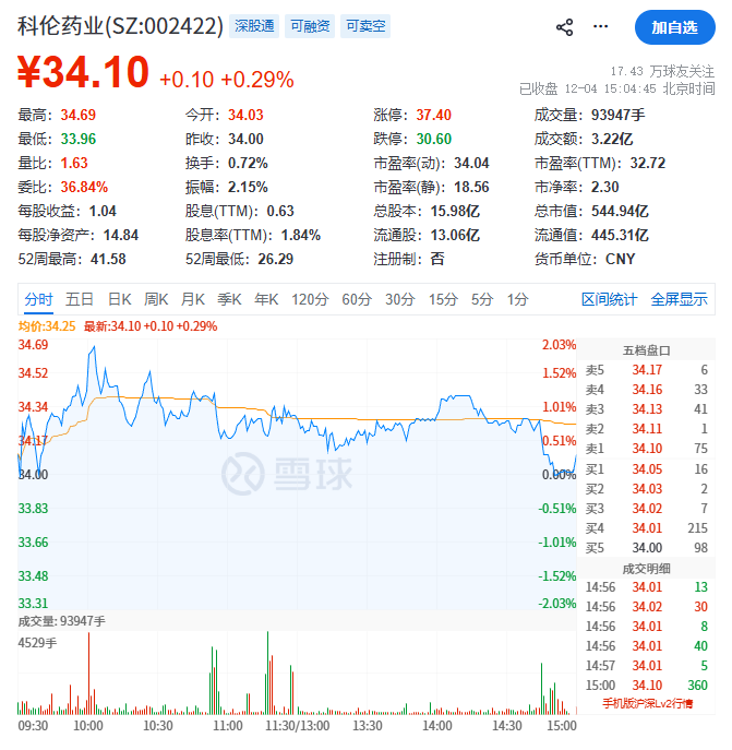 二级市场上,截至12月4日收盘,科伦药业涨0.29%,报34.1元/股,总市值544.94亿元。