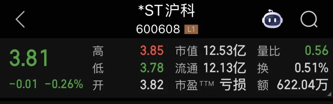 截至12月12日收盘,*ST沪科股价为3.81元,跌幅为0.26%,市值仅有12.53亿元。