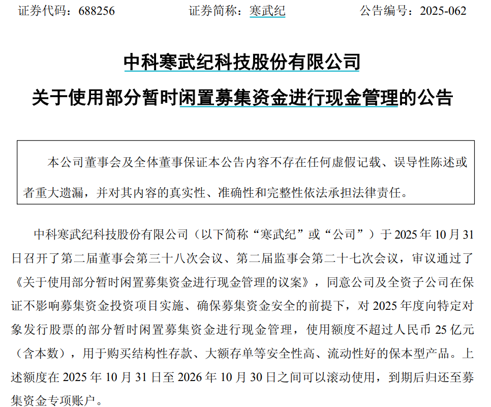 今年9月底,寒武纪39.5亿元定增资金到位后,11月宣布用最多25亿元进行现金管理。