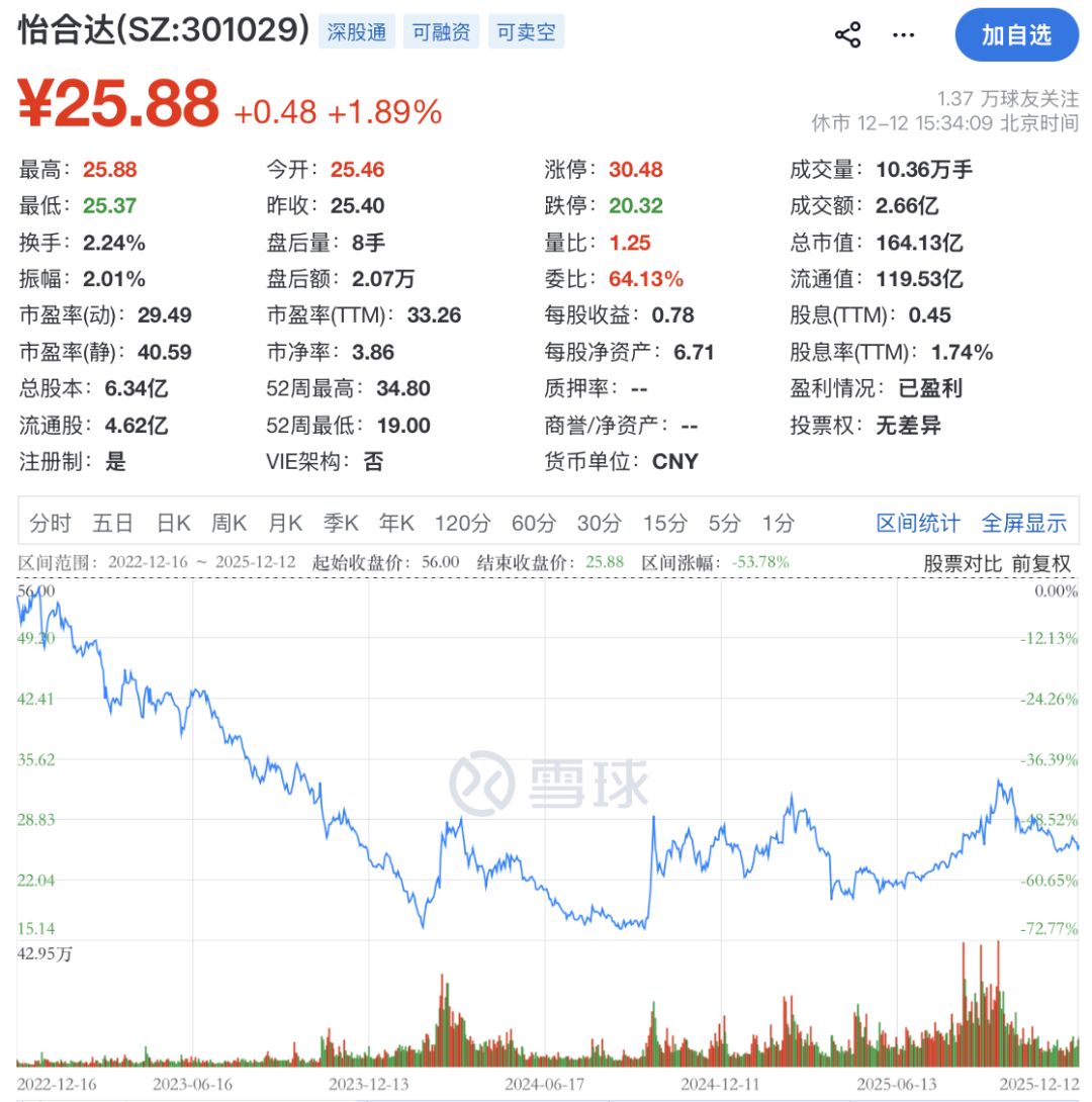 二级市场上,怡合达最新股价报25.88元/股,总市值164.13亿元,拉长时间线看,近三年,该股股价已“腰斩”。