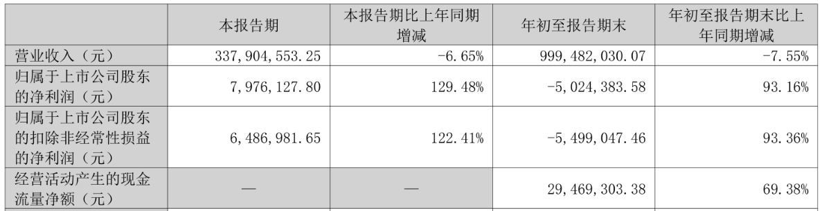 中国经济网北京12月14日讯宝明科技(002992)(002992.SZ)近日披露2025年第三季度报告。前三季度公司实现营业收入9.99亿元,同比下降7.55%;归属于上市公司股东的净利润为-502.44万元,上年同期为-7345.43万元;归属于上市公司股东的扣非净利润为-549.9万元,上年同期为-8277.20万元;经营活动产生的现金流量净额为2946.93万元,同比增长69.38%。