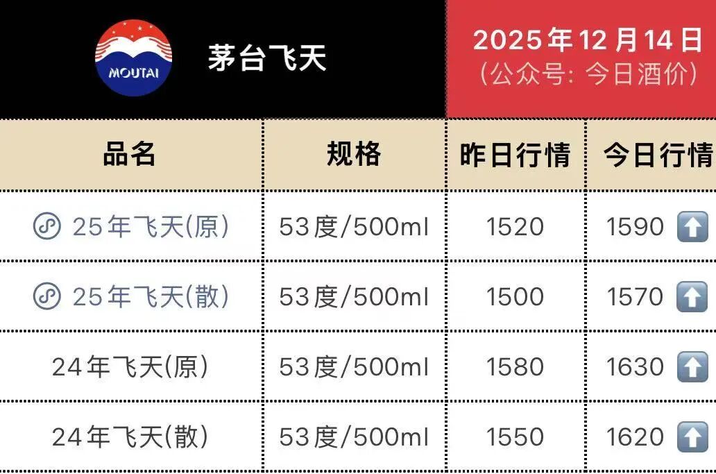 大反攻!第三方平台“今日酒价”数据显示,12月14日,2025年飞天茅台(53度/500ml,下同)散瓶批发参考价报1570元/瓶,较上一日大涨70元;原箱报1590元/瓶,较上一日大涨70元;2024年飞天茅台散瓶批发参考价报1620元/瓶,较上一日大涨70元;原箱报1630元/瓶,较上一日大涨50元。
