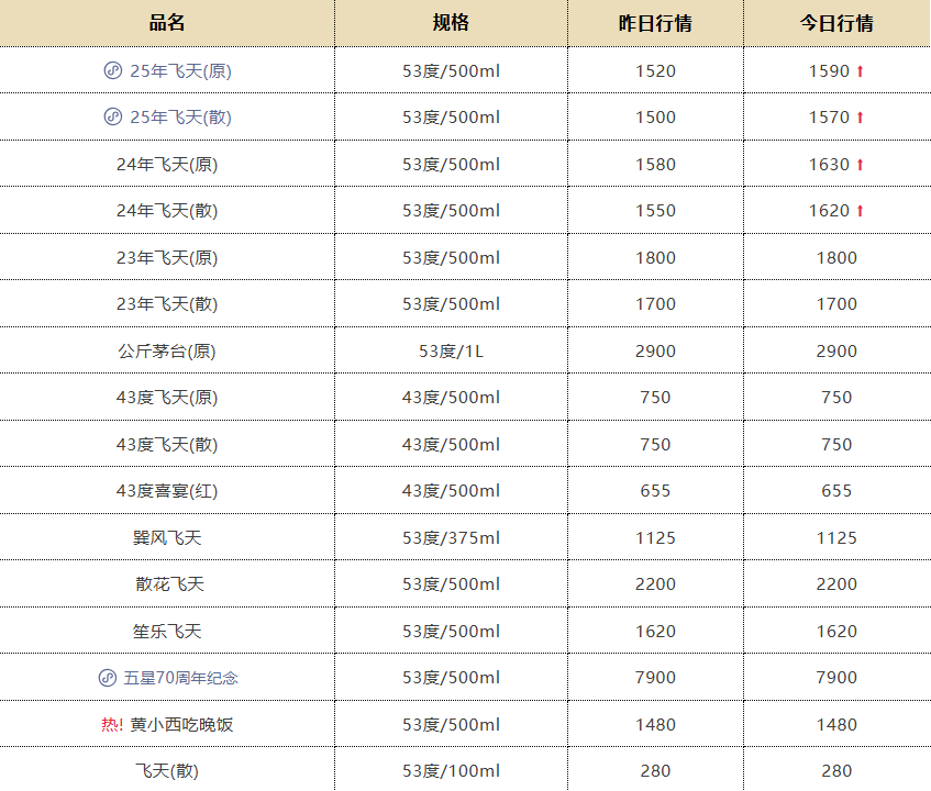 12月14日,第三方酒价平台“今日酒价”微信公众号发布的数据显示,2025年53度500ml飞天茅台原箱批发价涨至1590元/瓶,散瓶批发价为1570元/瓶,均较前一日单瓶涨70元。12月12日,上述产品原箱、散瓶批发价分别跌至1495元/瓶、1485元/瓶,双双跌破1499元/瓶的官方指导价。