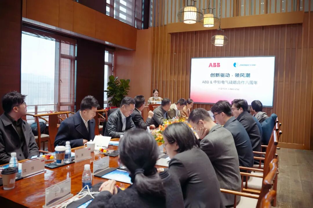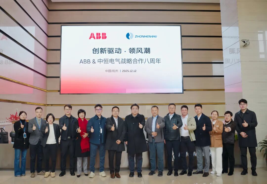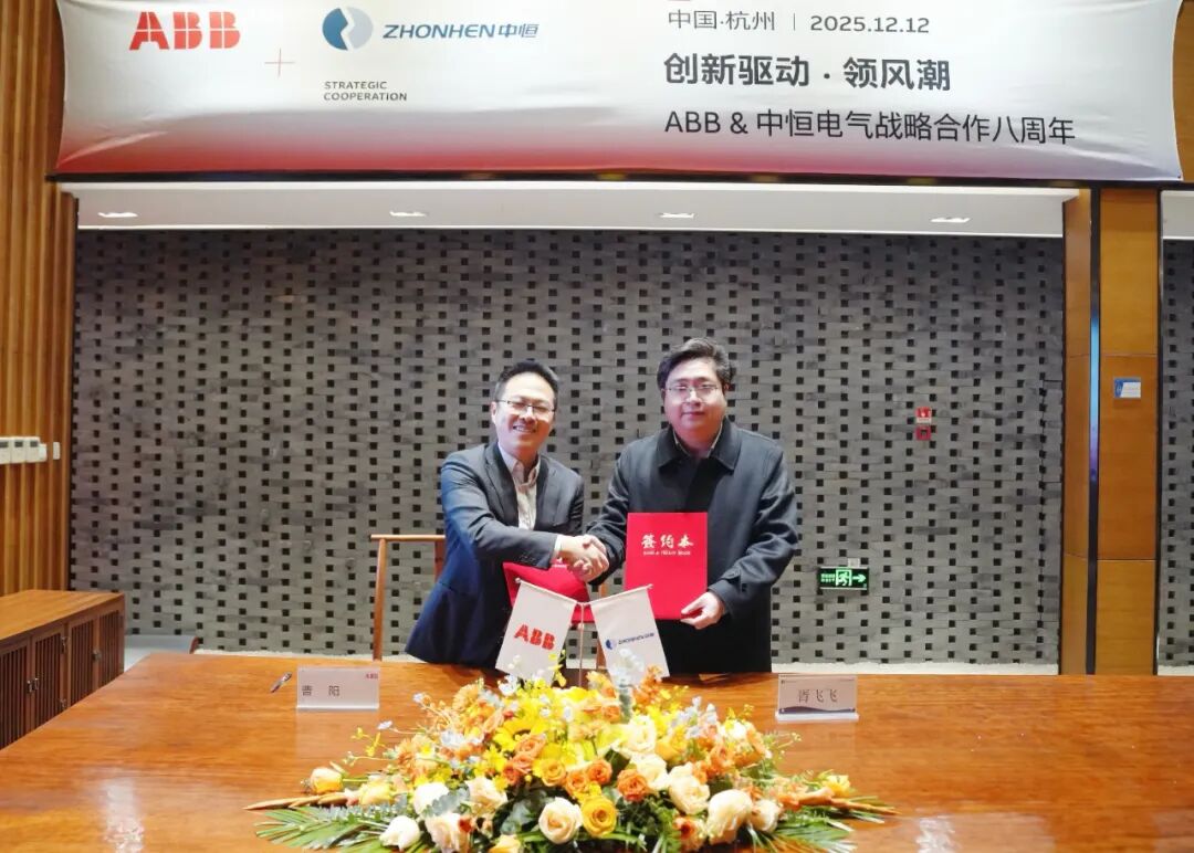 2025年12月12日下午,杭州中恒电气(002364)股份有限公司(以下简称:中恒电气)与ABB(中国)有限公司电气事业部(以下简称:ABB)在杭州中恒电气总部举办了主题为“创新驱动.领风潮”战略合作八周年签约仪式。