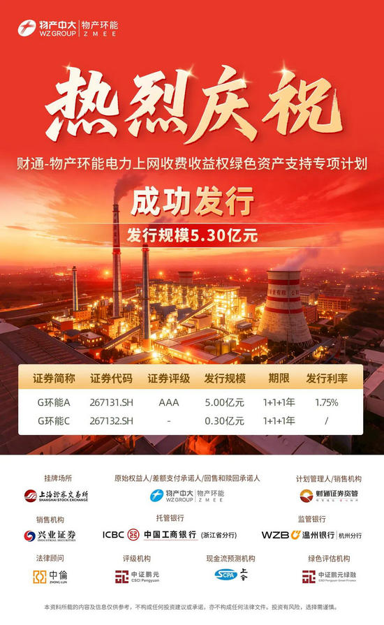 物产环能表示,公司深耕绿色金融,助力可持续发展。本次专项计划的成功发行,是公司在绿色金融领域的又一次重要实践与突破。这不仅拓宽了公司的融资渠道,更构建起“绿色运营—资产盘活—资金回流—再投资”的良性循环,为公司主业可持续发展注入新动力。未来,公司将继续深化金融创新,用好用活各类绿色金融工具,持续提升绿色能源供应与服务能力,积极践行“双碳”目标,为经济社会全面绿色转型及碳达峰、碳中和目标的实现贡献环能力量。(厉平)