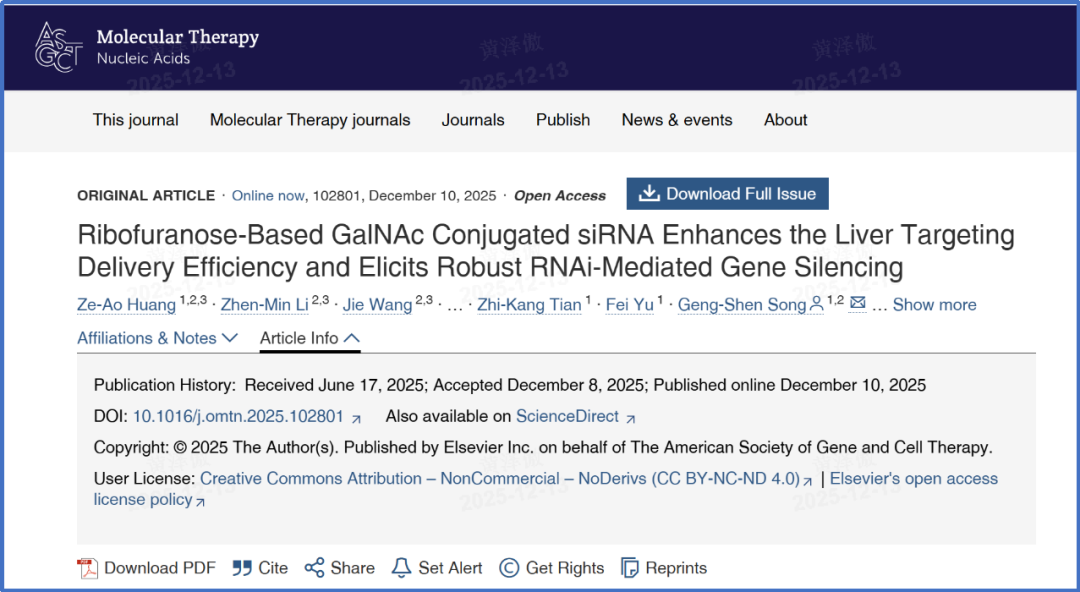 悦康药业新型GalNAc递送系统的研究成果登上Molecular Therapy Nucleic Acids
