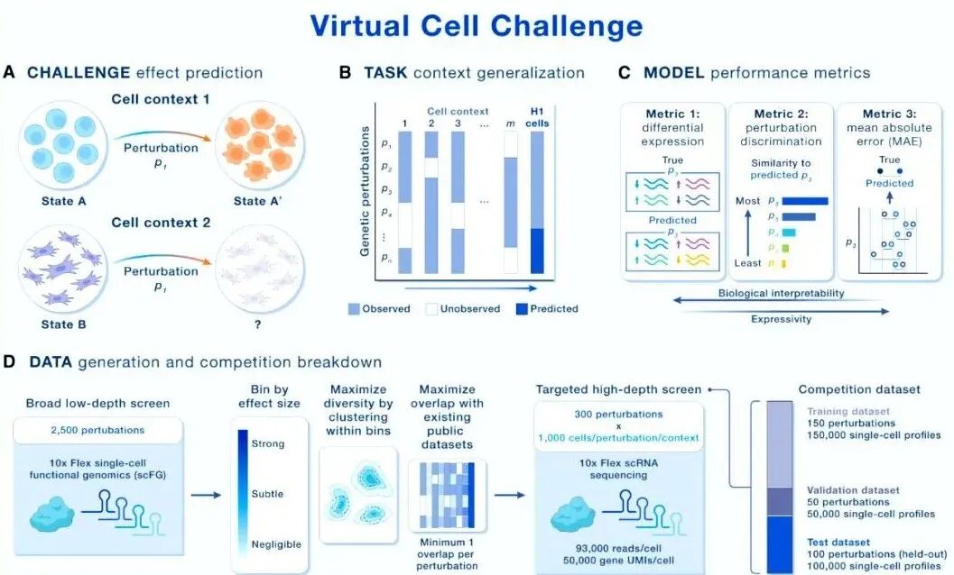 虚拟细胞挑战赛概览(来源:Cell):在虚拟细胞挑战赛中,参赛者将开发虚拟细胞模型来预测基因和化学干扰对细胞群体转录的影响。给定未受干扰的细胞状态,任务在于推断细胞在受到特定干扰后基因表达的反应。