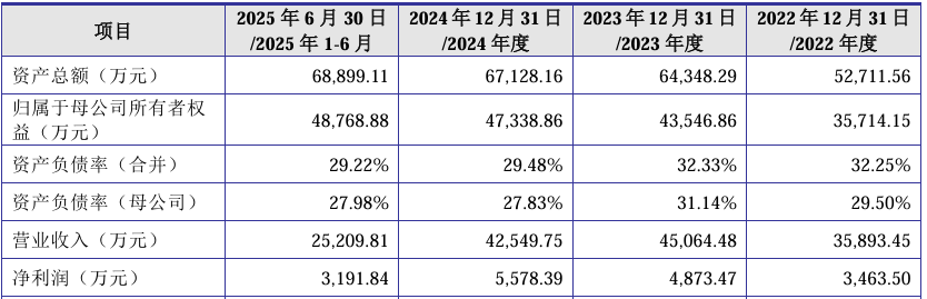 财务方面,于2022年度、2023年度、2024年度及2025年1-6月,公司实现营业收入分别约为3.59亿元、4.51亿元、4.25亿元、2.52亿元人民币;同期,公司净利润分别为3463.50万元、4873.47万元、5578.39万元、3191.84万元人民币。