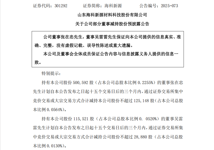 公告显示,海科新源资管计划、张在忠、吴雷雷的减持计划实施时间,均是自本次公告披露之日起15个交易日后的3个月内(2025年12月26日至2026年3月25日,窗口期不减持)。