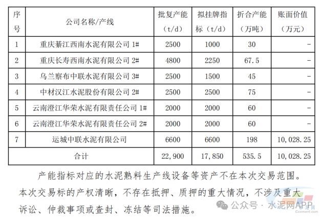 12月12日晚,天山股份(000877)发布公告称,为最大程度发挥现有产能价值,结合生产线实际情况,公司所属子公司拟将下属7条水泥熟料生产线的产能指标以公开挂牌方式进行转让,拟挂牌的产能指标合计17,850t/d,折合535.5万吨,转让金额合计约29,752.65 万元。