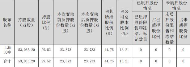 公司11月14日披露的关于控股股东部分股份解质押及质押展期的公告显示,公司近日接到控股股东上海天神通知,上海天神将其所持公司1.45%的股份办理了质押展期业务,质权人分别为中信证券、中金财富;将其所持公司0.08%的股份办理了解除质押业务,质权人为银河证券、东吴证券、国联民生(601456)。截至公告披露日,上海天神本次变动后质押股份数量23,733万股,占其所持股份比例44.75%,占公司总股本比例13.21%。