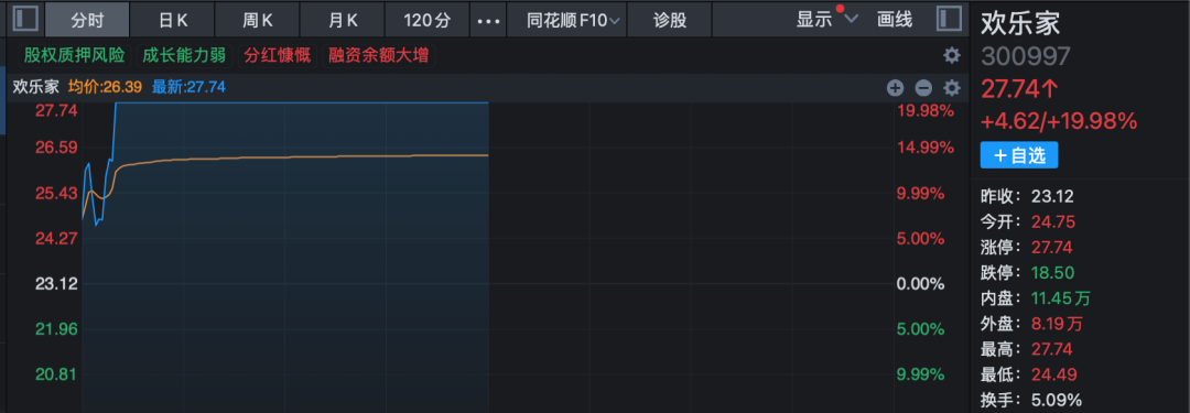 随着元旦春节消费旺季的来临,食品饮料概念股有预先走强的趋势。早间食品饮料行业全线上扬,饮料乳品方向领涨,板块指数高开高走,盘中一度放量涨逾2%,半日成交超前一交易日全天成交。欢乐家(300997)高开后仅约9分钟就20%涨停,皇氏集团(002329)低开后仅约2分钟垂直涨停,阳光乳业(001318)、均瑶健康(605388)等也均直线涨停。