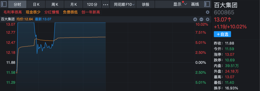 商业物业经营、新零售、一般零售、免税概念等板块也跟随上涨。百大集团(600865)低开后仅约2分钟垂直涨停,连续第3日封板,股价创2017年3月以来8年半新高(复权)。美之高、盈新发展(000620)、农产品等也强势涨停或涨超10%。