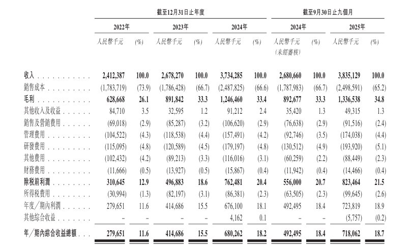 于2022年度、2023年度、2024年度、2025年截至9月30日止九个月,公司分别录得收入24.12亿元(人民币,下同)、26.78亿元、37.34亿元、38.35亿元。