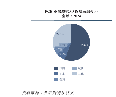 从地区角度来看,2024年在全球PCB市场,中国以56.0%的份额占据主导地位,位列其后的是日本(7.9%)、美洲(4.7%)及欧洲(2.2%)。