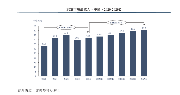 按销售额统计,中国PCB市场从2020年的333.0亿美元增长至2024年的420.0亿美元,期间年复合增长率为6.0%。未来,中国PCB市场预计在2029年将达到503.0亿美元,相较 2024年的年复合增长率为3.7%。