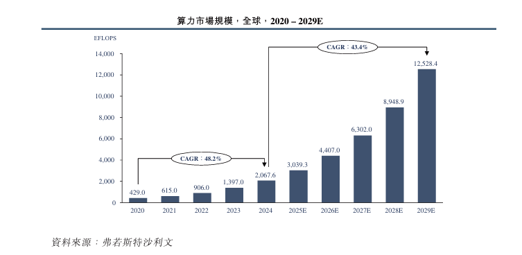 全球算力规模从2020年的429.0 EFLOPS增长至2024年的2067.6 EFLOPS,期间年复合增长率为48.2%,并预计于2029年达到12528.4 EFLOPS,2024年至2029年的年复合增长率为43.4%。