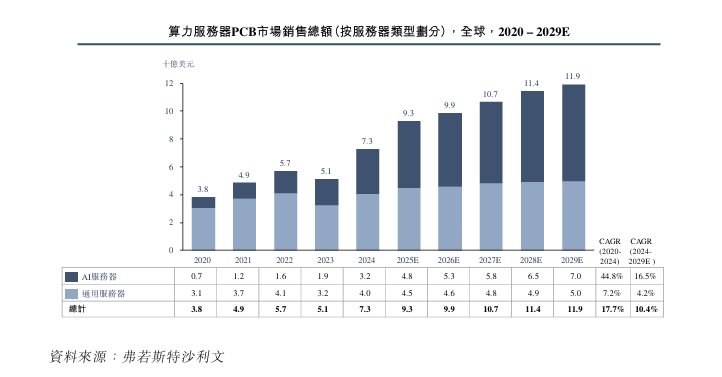 按销售额计,全球算力服务器PCB市场规模从2020年的38.0亿美元增长至2024年的 73.0亿美元,期间年复合增长率为17.7%,并预计于2029年达到119.0亿美元,2024年至 2029年的年复合增长率为10.4%。
