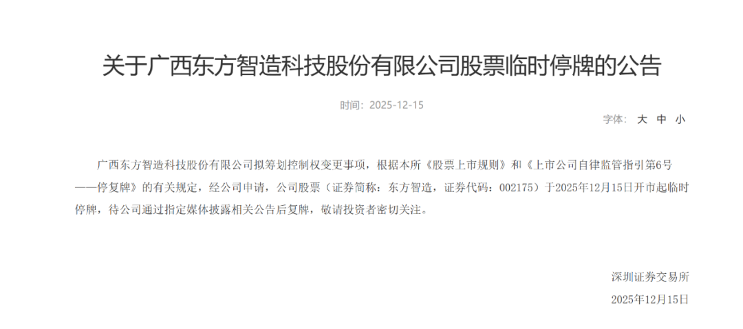 12月15日盘前,深交所公告称,东方智造(002175)(证券代码:002175)拟筹划控制权变更事项,根据有关规定,经公司申请,公司股票于12月15日开市起临时停牌。