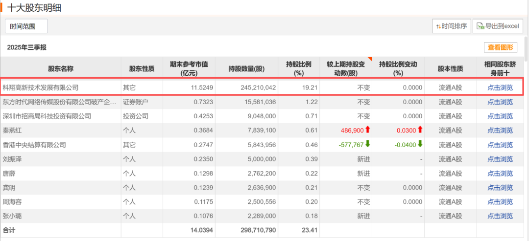 当前,东方智造的控股股东为科翔高新技术发展有限公司(以下简称科翔高新),实控人为李斌。截至2025年三季度末,科翔高新持有东方智造2.45亿股,持股占比为19.21%。