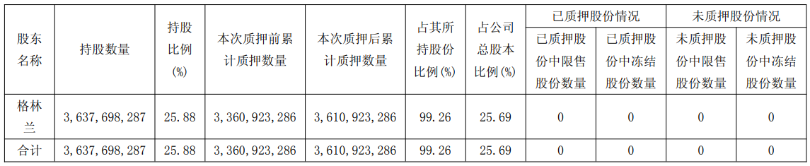 截至公告披露日,格林兰持有绿地控股3,637,698,287股,本次质押后累计质押数量为3,610,923,286股,占其所持股份的99.26%,占公司总股本的25.69%。