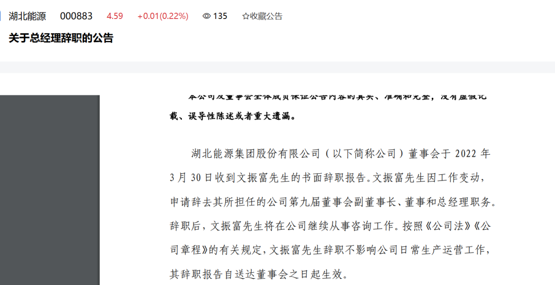 据湖北能源公告,文振富于2022年3月30日离任,原因是辞职。公告称,文振富因工作变动,申请辞去其所担任的公司第九届董事会副董事长、董事和总经理职务。