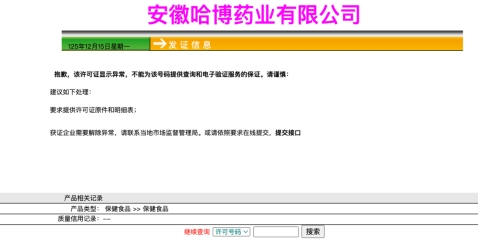 值得注意的是,记者在全国工业产品生产许可证公示查询系统中查询该产品标注的食品生产许可证号,显示为哈博药业生产,但详情页提示该许可证状态异常,无法提供查询和电子验证服务。