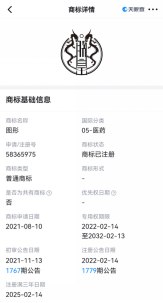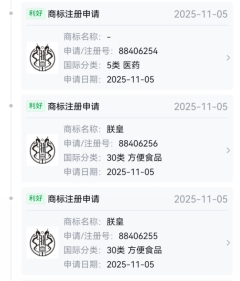 天眼查显示,同仁堂四川公司医药、食品、广告销售等类的“朕皇”商标于2021年8月10日申请注册,并于2022年2月14日注册成功,专用权限为2022年2月14日至2032年2月3日。2025年2月至11月,该公司又多次进行相关商标方便食品、医药等类的注册申请,目前多款相关商标状态均显示为“等待实质审查”。