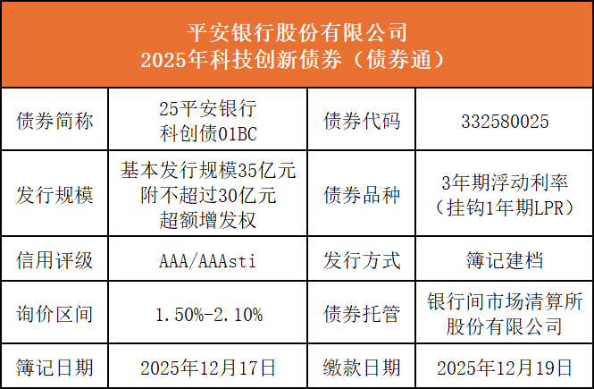 2025年12月17日,平安银行(000001)股份有限公司(以下简称“平安银行”)将在全国银行间债券市场簿记发行2025年科技创新债券(债券通)。本期债券为3年期浮动利率债券,基本发行规模35亿元,附不超过30亿元超额增发权,主体评级为AAA,债项评级为AAAsti,募集资金将依据适用法律和主管部门的批准投向《金融“五篇大文章”总体统计制度(试行)》中规定的科创领域,包括发放科技贷款、投资科技创新企业发行的债券等,专项支持科技创新领域业务。