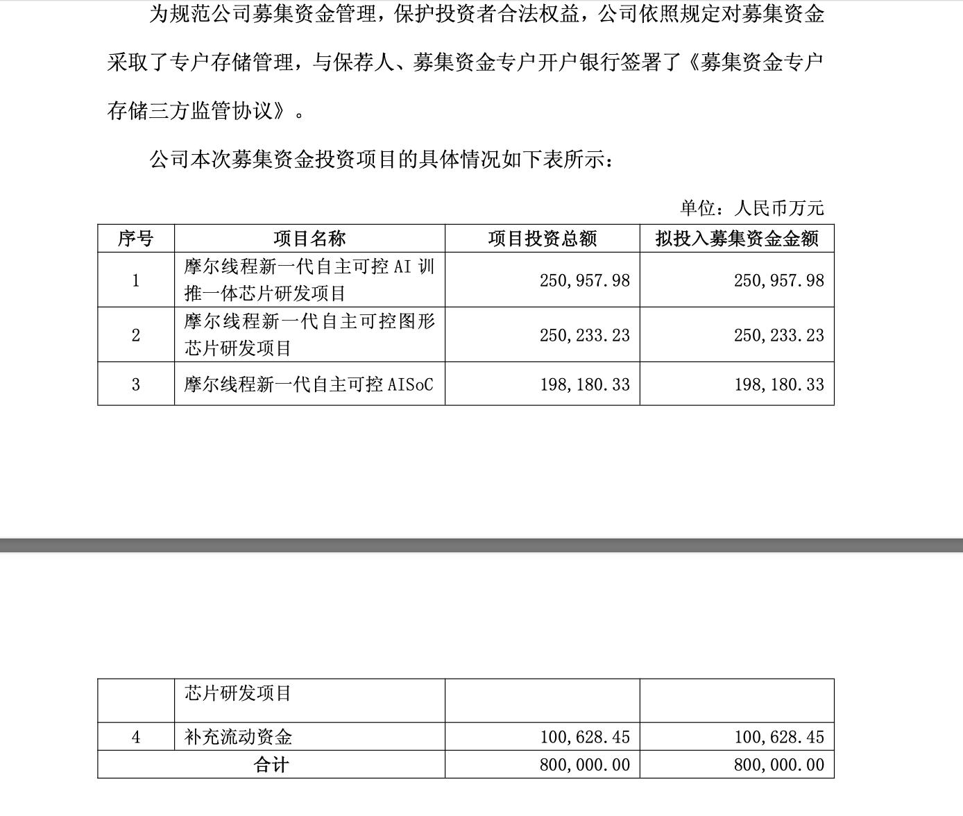 而据此前披露的资金使用计划,摩尔线程募资的80亿元,将用于摩尔线程新一代自主可控AI训推一体芯片研发项目、摩尔线程新一代自主可控图形芯片研发项目、摩尔线程新一代自主可控AI SoC芯片研发项目及补充流动资金。