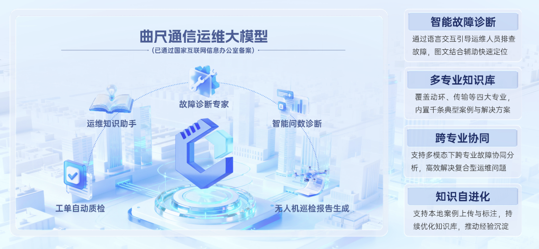 “曲尺通信运维大模型”专为通信行业深度定制,以运维数字化与智能化的“超级大脑”为定位,依托多源知识融合与智能诊断技术,实现从故障预测、自动化调度到远程运维的全链条功能覆盖。目前,“曲尺通信运维大模型”已获国家互联网信息办公室备案认证,成为行业智能化转型的标杆成果。