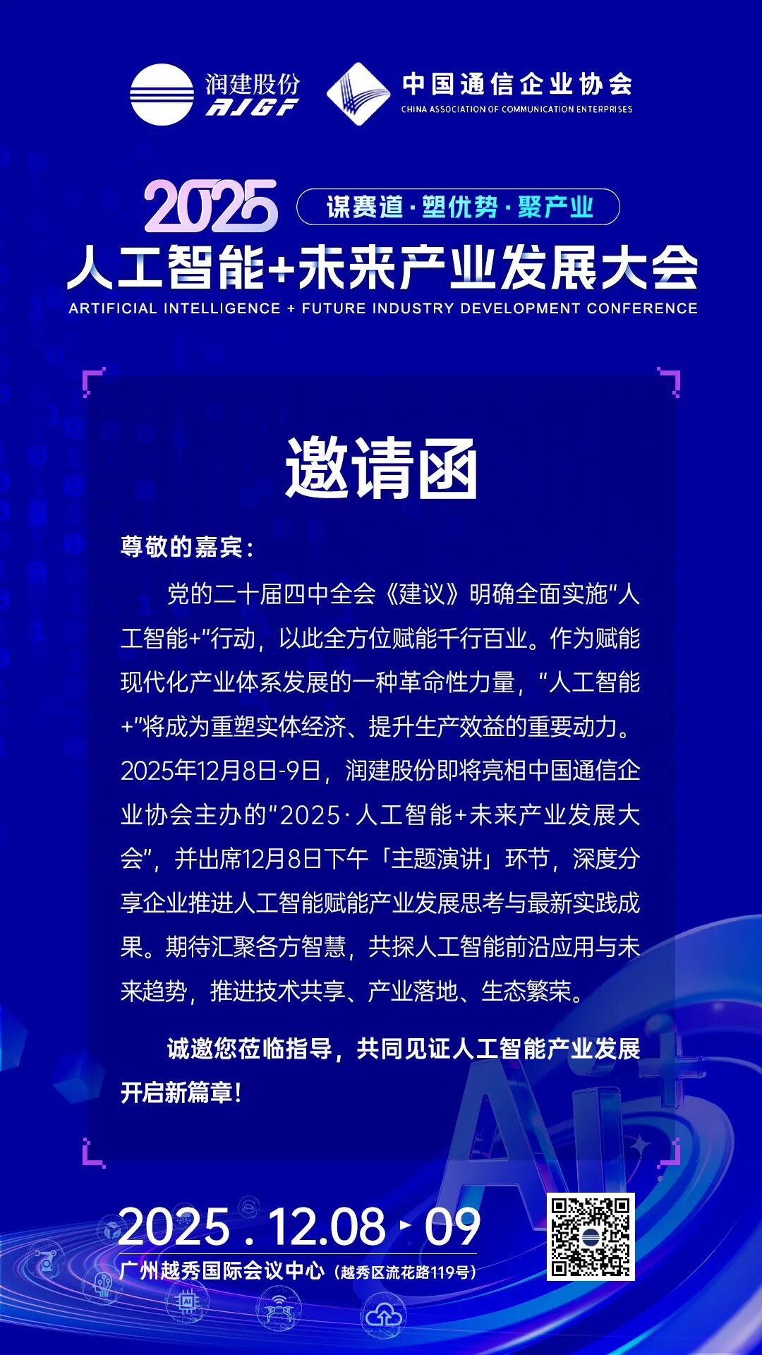 为积极响应国家“人工智能+”行动部署,推动AI技术与未来产业深度融合与创新,12月8日至9日,由中国通信企业协会主办的“2025人工智能+未来产业发展大会”将在广州越秀国际会议中心举行。大会以“谋赛道塑优势聚产业”为主题,旨在搭建跨界交流、合作共赢的高端平台,汇聚产业智慧,共绘AI发展新蓝图。润建股份(002929)受邀参与本次盛会,并将精彩亮相大会未来产业展区C01展位,期待携手更多行业伙伴,共探人工智能前沿应用与未来趋势,推进技术共享、产业落地、生态繁荣。
