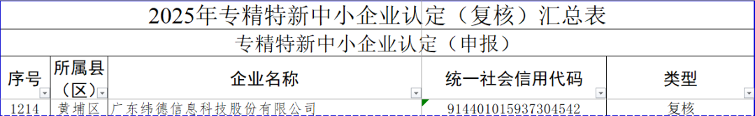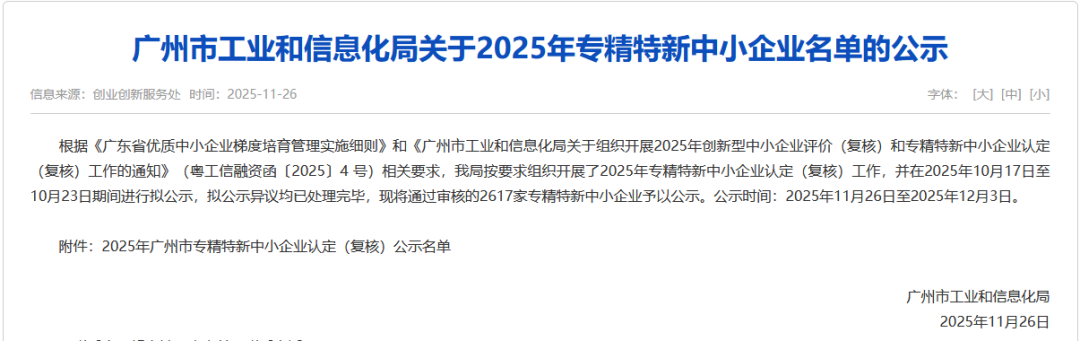 近日,广州市工业和信息化局发布《关于2025年专精特新中小企业名单的公示》,纬德信息通过省级专精特新中小企业复核。