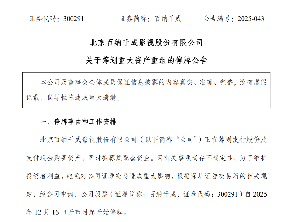 12月15日晚,百纳千成发布公告,公司正在筹划发行股份及支付现金购买厦门众联世纪股份有限公司(以下简称“众联世纪”)100%股权,同时拟募集配套资金。经公司申请,公司股票自2025年12月16日开市时起开始停牌。
