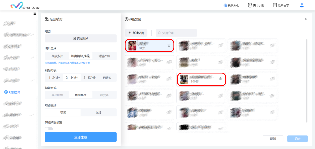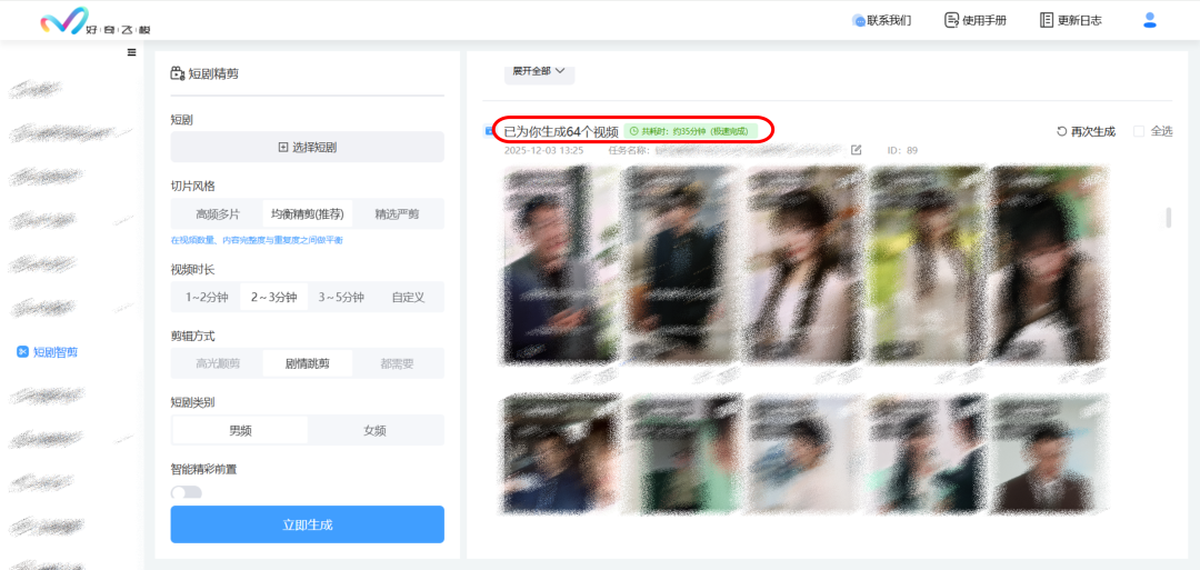 切片完成:原短剧100集,约35分钟完成64支切片视频