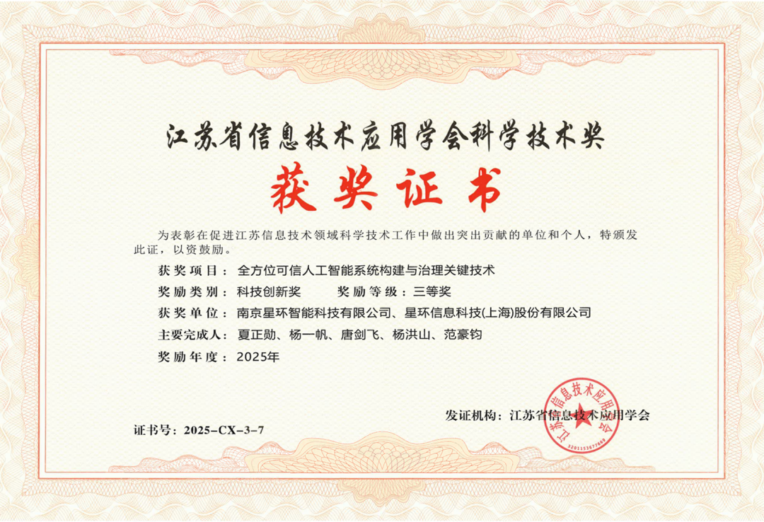 近日,江苏省信息技术应用学会正式公布了2025年度科学技术奖获奖名单。星环科技申报的“全方位可信人工智能系统构建与治理关键技术”项目,凭借其突出的技术创新性与应用价值,荣获“科技创新奖”三等奖。这一荣誉标志着星环科技在可信人工智能这一前沿核心领域的研发实力与技术成果获得了省级行业权威机构的高度认可。