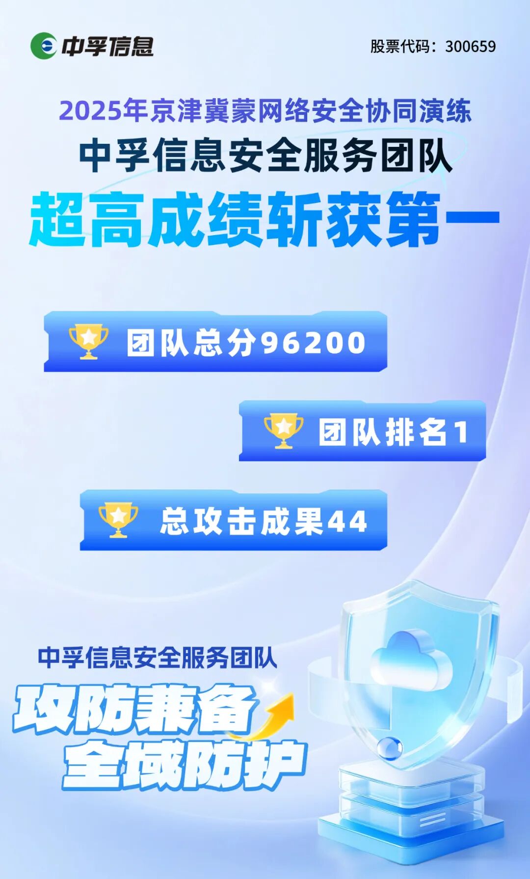 近日,“2025年京津冀蒙网络安全协同演练”圆满落幕,中孚信息(300659)安全服务团队从4省市网信办严格遴选的12支顶尖战队中强势突围,以96200分的超高成绩斩获第一!这份冠军荣誉,不仅是团队实战能力的巅峰印证,更是中孚信息深耕网络安全领域、护航数字经济发展的权威背书。