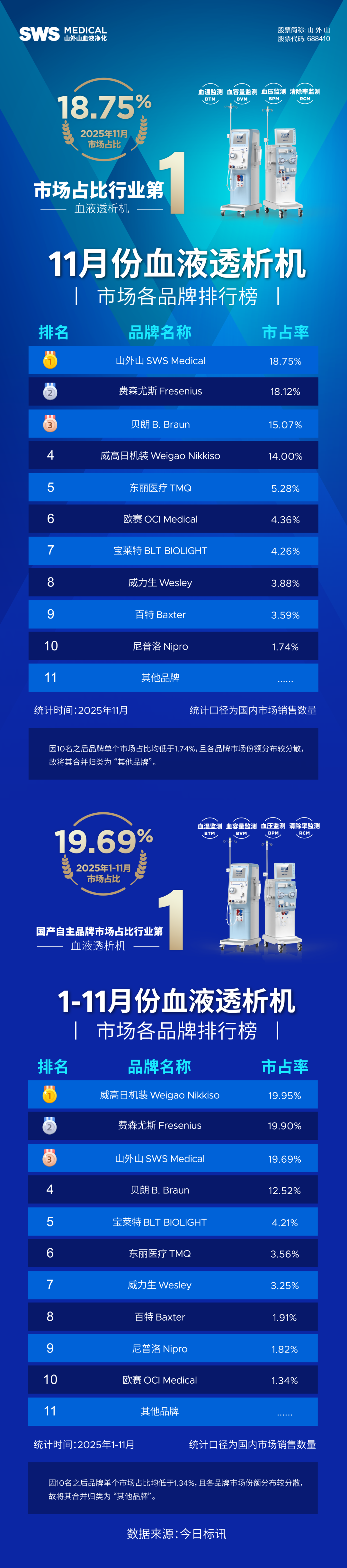 国内市场,山外山同样保持领先优势。根据今日标讯数据显示,2025年1-11月,公司血液透析机与连续性血液净化设备(CRRT)的市场占有率分别以19.69%、18.32%稳居行业榜首,持续领跑国内血液净化设备市场。