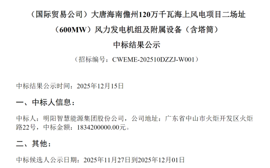 同日,明阳智能中标大唐海南儋州120万千瓦海上风电项目二场址(600MW)风力发电机组及附属设备(含塔筒),金额为18.342亿元,合3057元/千瓦。