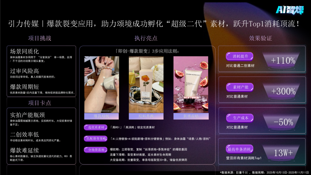 与普通二创素材比,其消耗提升110%,产能增300%,成本降50%,单条最高消耗居首,实现效率效果双提升。