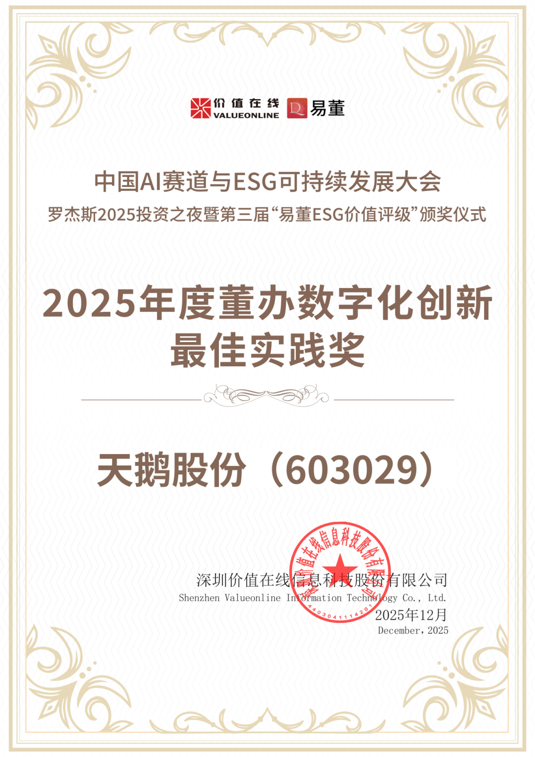 近日,由深圳价值在线主办的“闪耀光明 智见未来——中国AI赛道与ESG可持续发展大会”在深圳隆重举行。天鹅股份(603029)凭借在公司治理及数字化创新领域、投资者关系管理领域的出色表现,荣获“2025年度董办数字化创新最佳实践奖”“2025年度上市公司卓越投关建设奖”。以上奖项由价值在线邀请可持续发展领域的行业专家学者组成评审团,以国际化、多元化、全面化的科学视角综合评价参选对象,秉承客观、公正、透明的原则,遴选出国内具有代表性的可持续发展标杆主体与案例典范。